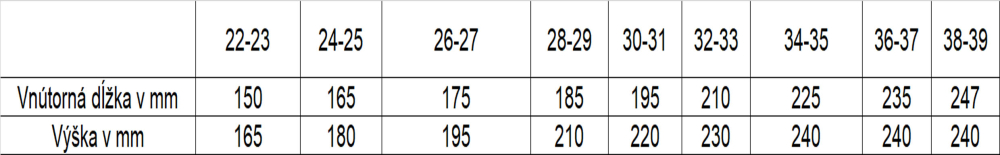 | Vnútorná dĺžka v mm | 150 | 165 | 175 | 185 | 195 | 210 | 225 |