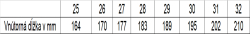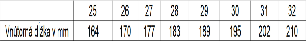 | Vnútorná dĺžka v mm | 164 | 170 | 177 | 183 | 189 | 195 | 202 | 210 |